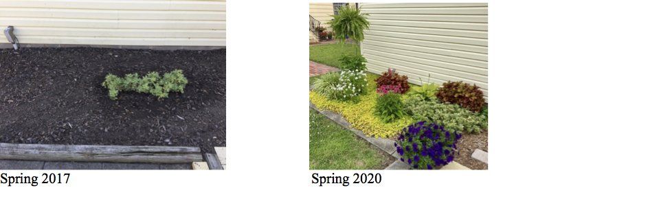 Once I caught the gardening fever, the next year I started garden bed #2. The focus was still on perennials and if they had flowers, great! I went with coneflowers, verbena, liriope, hostas, coral bells and some colorful annuals. Creeping Jenny ground cover added a lovely way to minimize weeds.