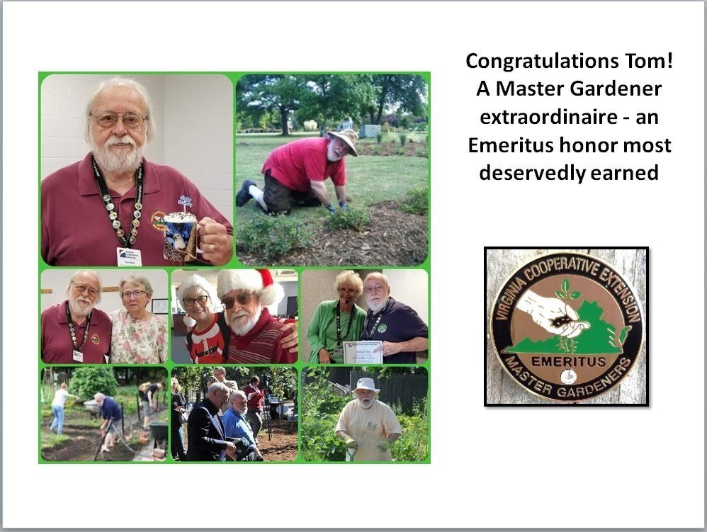 Congratulations to Tom Bolt, Class of 1999, who was awarded Emeritus status in recognition of his extensive work over 21 years as a Norfolk Extension Master Gardener.