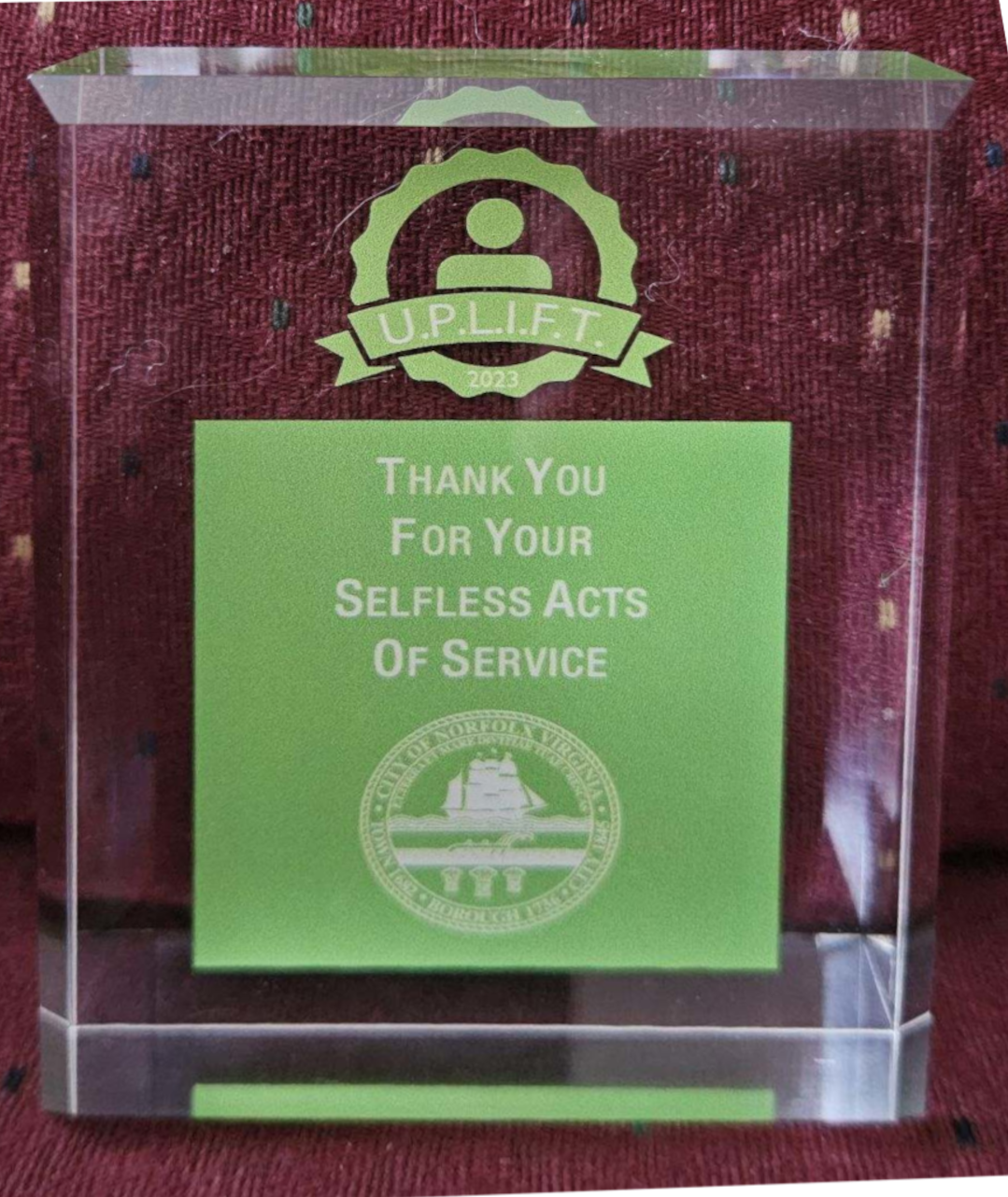 Although there’s only one plaque, shown above, the award is intended to recognize the role of each individual NMG in fulfilling our mission. Along with this small trophy, we received a note from the mayor, the Hon. Kenny Alexander. It reads in part: “As Mayor of Norfolk, it is with much pride that I recognize each of you for making a difference in your community and commend you on being a recipient of the 2023 U.P.L.I.F.T Award. This is an honor for which you should be proud. It is your selfless service and willingness to engage and uplift your neighbors that makes Norfolk the best place to live, play and raise a family…Congratulations on receiving the 2023 U.P.L.I.F.T. Award and thank you for all that you do to make a positive impact on our community…”