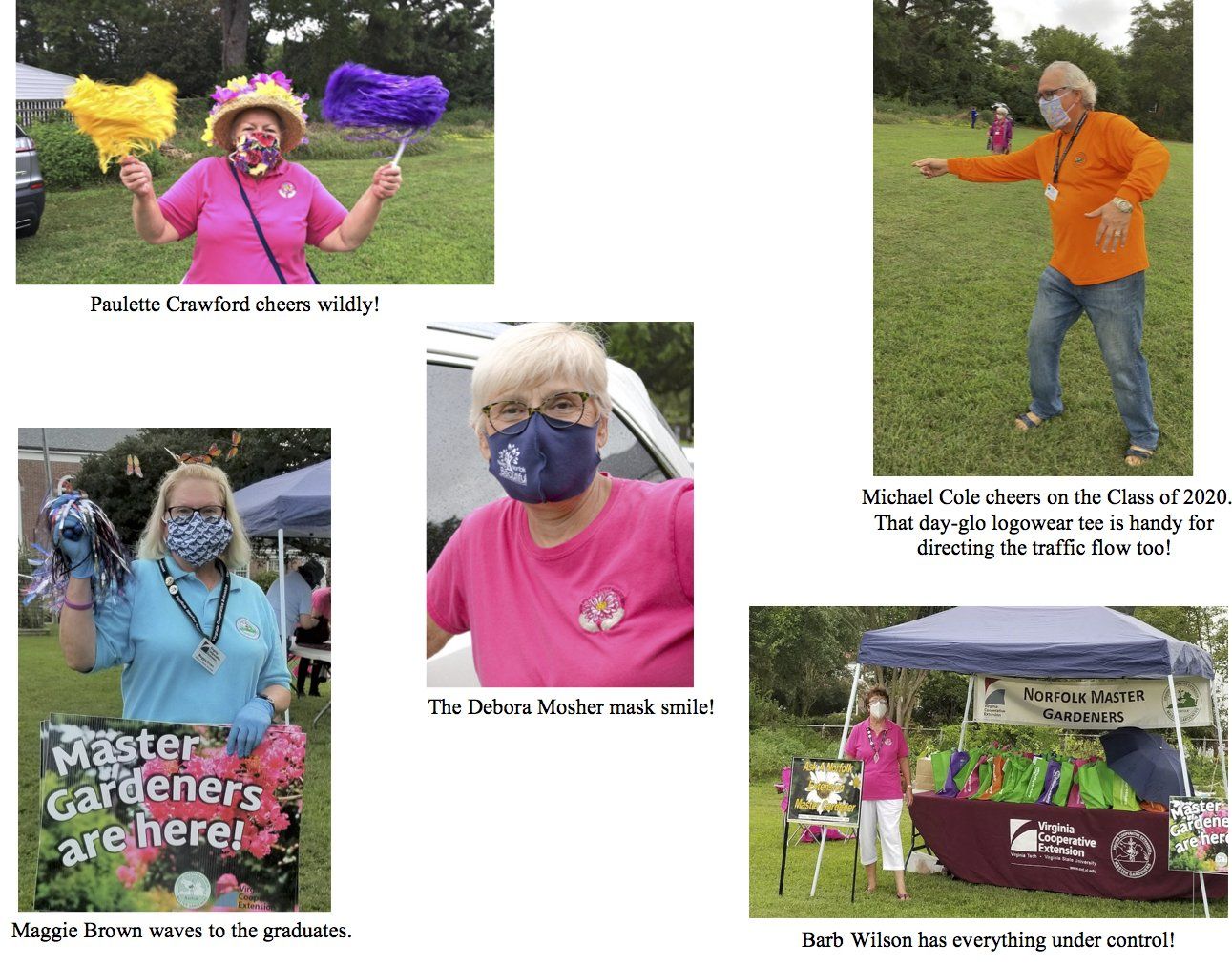 On September 1, 2020 from 6:30 to 7:30 pm, 22 members of the Norfolk Master Gardener Class of 2020 drove through the grassy parking area at the Royster Presbyterian Church on Newport Avenue, receiving their certificates and badges among wildly cheering, masked and socially distanced Perennials. This was completely different, and completely wonderful! Only two of the new Interns needed to have their graduation items delivered to them. All 24 of our original 24 class members made it through the in-person classes, the remote learning and project presentations and final exam. Four have already earned sufficient hours to attain active VCE Master Gardener status.