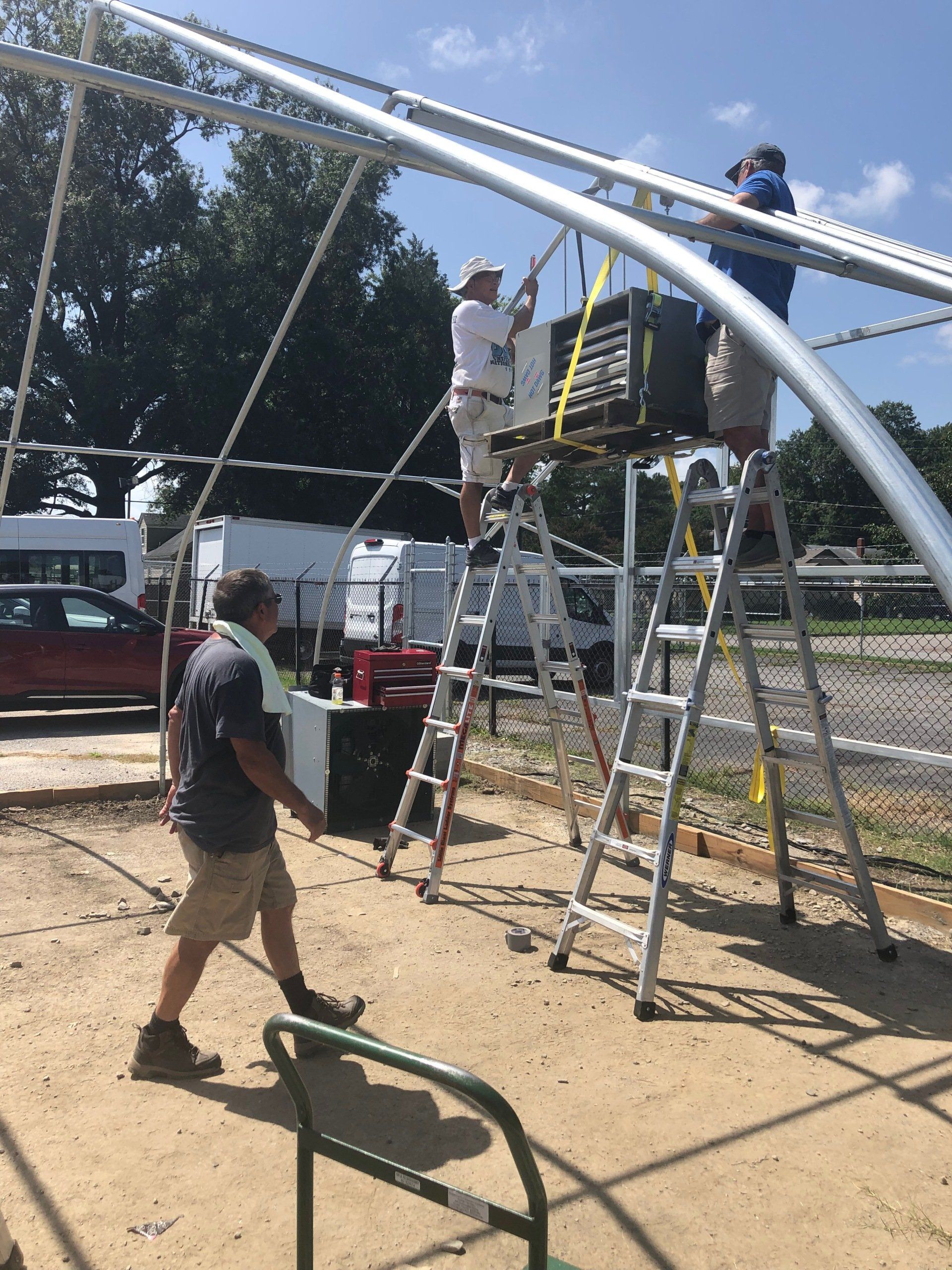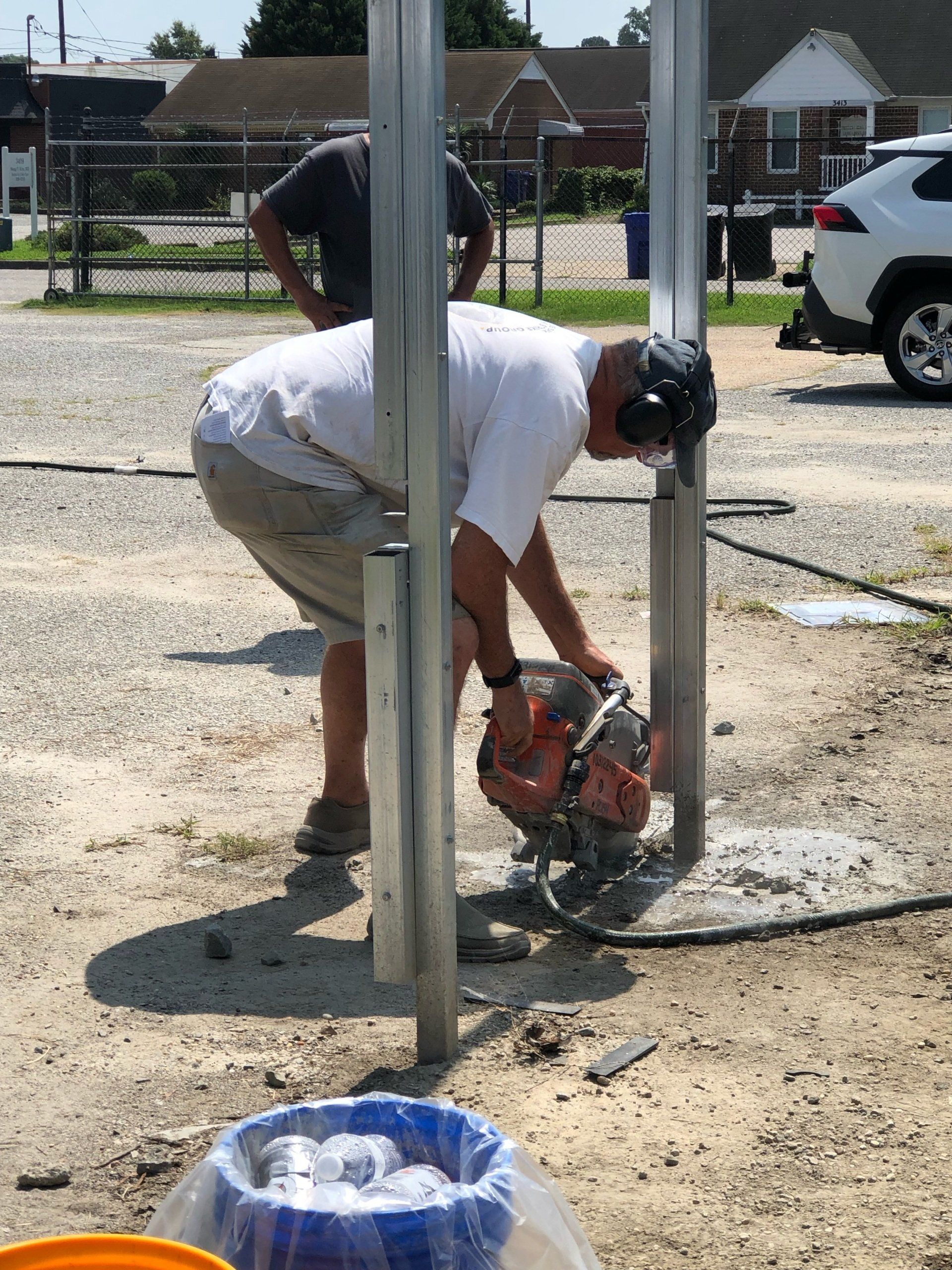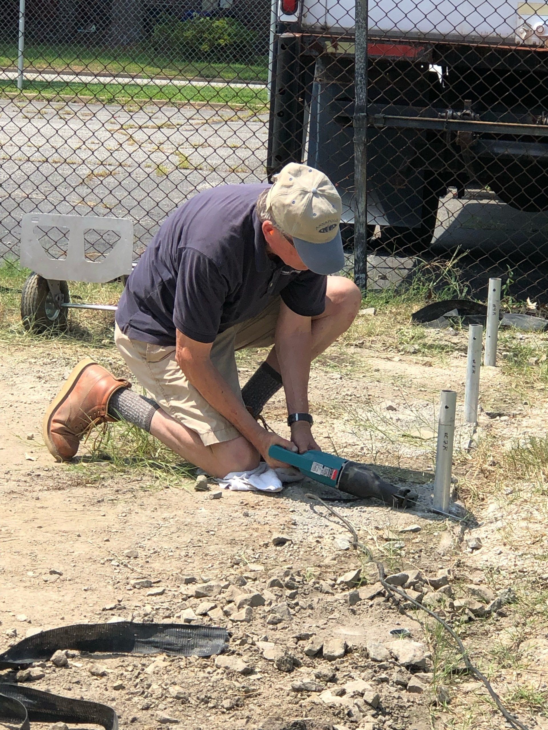 Pole sections were marked, disassembled, and staged. Then the heater was lowered using winches and Mitch’s truck with Mitch, Ziggy, and Will monitoring this job and Bob operating Mitch’s truck. Scary. It came down a little cock-eyed, but all was well. Tops of the poles were unhooked, lowered, labeled two times, and staged. These poles were angled and awkward! Screws were collected and labeled along with every other piece that was disassembled. Also scary was watching Mitch manhandle the concrete saw. After a few cuts, a pow wow determined that it would be best to cut the poles at the base because the concrete holding the poles reached to China.