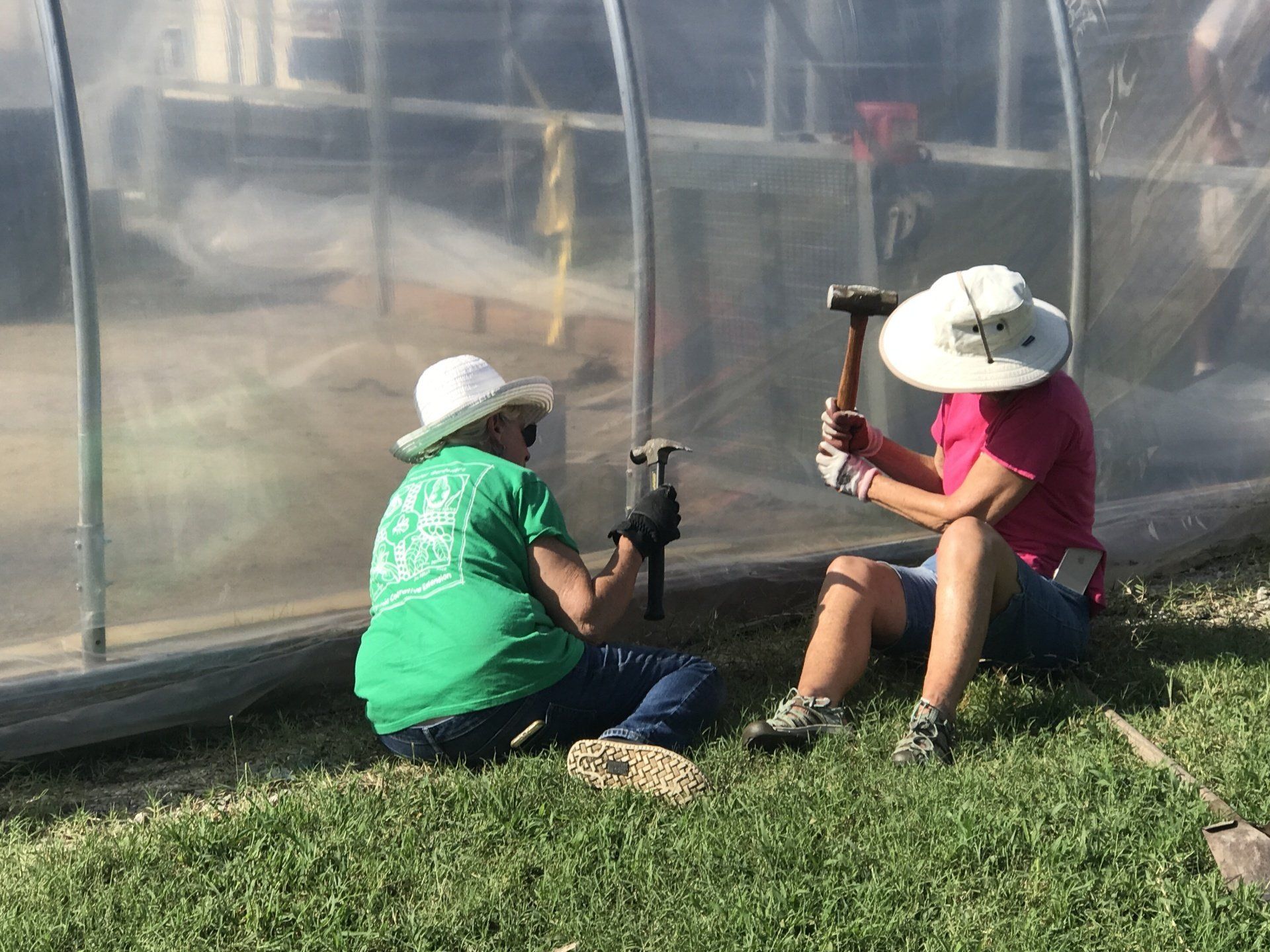 The volunteer efforts began on Friday, August 27. When Kay, Donna, and I first rolled up I thought OMG that is HUGE!!! Didn’t really sound that big until we actually saw it. We started out by pulling staples that were holding the plastic in place hoping to preserve the plastic for rebuild. Not! Where are our kneeling pads? After all the plastic was unstapled and detached from the top, the corners, and the sides, the Greenhouse Girls carefully pulled the plastic off all in one piece. Ahhhhhhhh!!! Each section was carefully folded and labeled two times. Yes, we labeled everything twice. In hindsight, we probably wouldn’t have taken such great care with the plastic because Chris said toss it, buy new. Hmmmm where was he on Friday?