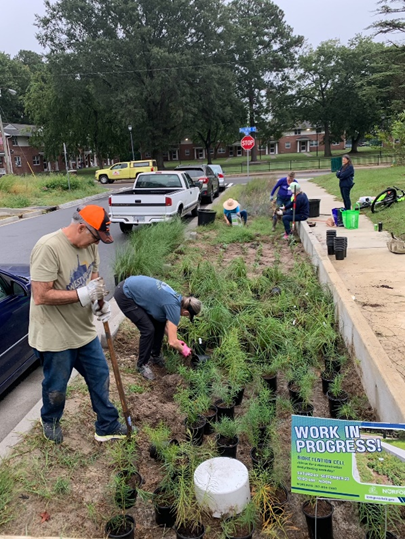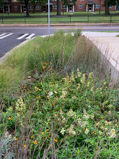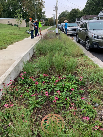 The recent Chesterfield Heights bioretention planting day was round two for this bioswale. It shows how stormwater runoff can be managed using attractive native plants and serves as a demonstration site for the whole community. The first two photos show the original planting, which we helped install last May. That section was unfortunately mowed by the contractors who are supposed to maintain these bioswales. Most of the plants survived, and even managed to bloom!
