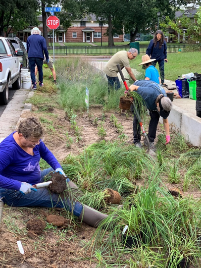 Late September found Norfolk Master Gardeners working with other volunteers in support of Margaret Epes with the city’s Office of Resilience. Last May, we helped to install a demonstration site of native plants at a highly visible intersection in Chesterfield Heights, a neighborhood bordering the Elizabeth River where many curbside verges have been replaced by 18-inch-deep bioswales. For all you future Water Stewards, a bioswale is simply a channel created to transport stormwater runoff from streets – in this case, the thickly-planted shallow ditch also captures litter and pollutants, keeping them out of the waterway.