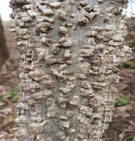 These photos show hackberry bark, leaves and fruit