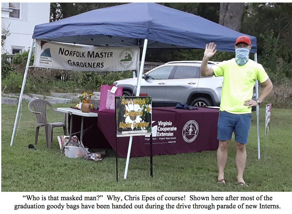On September 1, 2020 from 6:30 to 7:30 pm, 22 members of the Norfolk Master Gardener Class of 2020 drove through the grassy parking area at the Royster Presbyterian Church on Newport Avenue, receiving their certificates and badges among wildly cheering, masked and socially distanced Perennials. This was completely different, and completely wonderful! Only two of the new Interns needed to have their graduation items delivered to them. All 24 of our original 24 class members made it through the in-person classes, the remote learning and project presentations and final exam. Four have already earned sufficient hours to attain active VCE Master Gardener status.