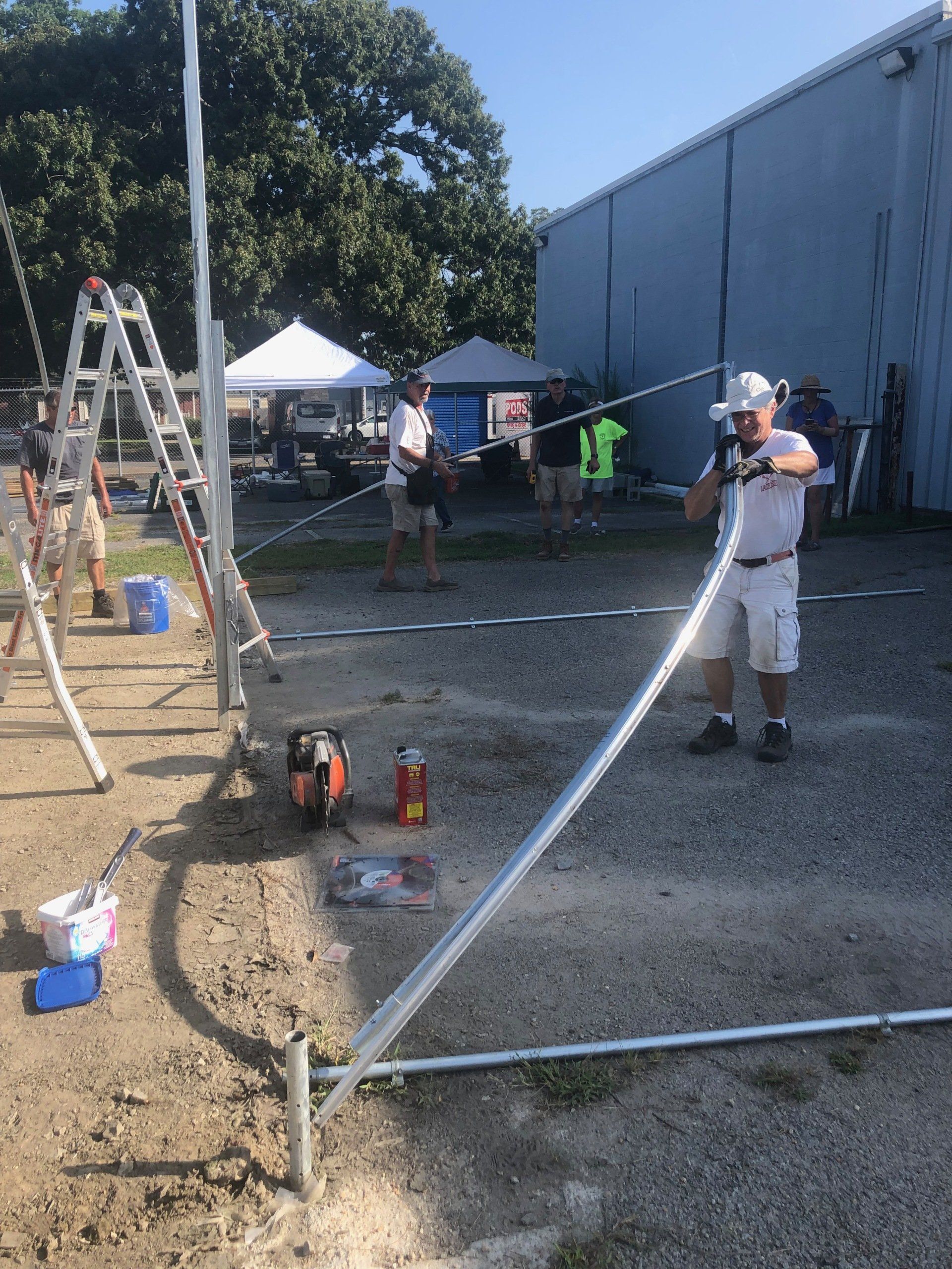Pole sections were marked, disassembled, and staged. Then the heater was lowered using winches and Mitch’s truck with Mitch, Ziggy, and Will monitoring this job and Bob operating Mitch’s truck. Scary. It came down a little cock-eyed, but all was well. Tops of the poles were unhooked, lowered, labeled two times, and staged. These poles were angled and awkward! Screws were collected and labeled along with every other piece that was disassembled. Also scary was watching Mitch manhandle the concrete saw. After a few cuts, a pow wow determined that it would be best to cut the poles at the base because the concrete holding the poles reached to China.